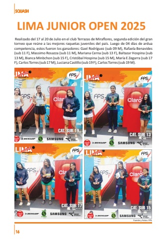 SQUASH16Fuente y Fotos: FPS ealizado del 17 al 20 de Julio en el club Terrazas de Miraflores, segunda edici%u00f3n del gran orneo que re%u00fane a las mejores raquetas juveniles del pa%u00eds. Luego de 04 d%u00edas de ardua ompetencia, estos fueron los ganadores: Gael Rodr%u00edguez (sub 09 M), Rafaela Benavides (sub 11 F), Massimo Rosazza (sub 11 M), Mariana Cerna (sub 13 F), Baltazar Hospina (sub 13 M), Bianca Minbchon (sub 15 F), Crist%u00f3bal Hospina (sub 15 M), Mar%u00eda E Zegarra