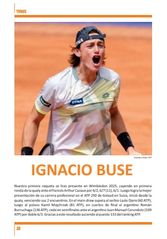 TENIS22Nuestra primera raqueta se hizo presente en Wimbledon 2025, cayendo en primera onda de la qualy ante el franc%u00e9s Arthur Cazaux por 6/2, 6/7 (11), 6/1. Luego logra la mejor presentaci%u00f3n de su carrera profesional en el ATP 250 de Gstaad en Suiza, inici%u00f3 desde la qualy, venciendo sus 2 encuentros. En el main draw supera al serbio Laslo Djere (60 ATP), luego al polaco Kamil Majchrzak (81 ATP), en cuartos de final al argen no Rom%u00e1n Burruchaga (136 ATP), cede en semifinales ante el argen no Juan Manuel Cerundolo (109 TP) por doble 6/3. Gracias a este resultado asciende al puesto 133 del ranking ATP. IGNACIO BUSEFuente y Foto: FPT