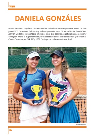 TENIS24Fuente y Foto: FPTNuestra raqueta trujillana con n%u00faa con su calendario de competencias en el circuito juvenil ITF. Enrumba a Colombia y se hace presente en el ITF World Junior Tennis Tour J100 en Medell%u00edn, coron%u00e1ndose en dobles junto a su coterr%u00e1nea Le cia Baz%u00e1n, al superar en la gran final a la dupla formada por la estadounidense Welles Newman y la britDANIELA GONZ%u00c1LES
