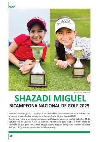 GOLFFuente y Foto: GolfPer%u00fa / SF 26SHAZADI MIGUELBICAMPEONA NACIONAL DE GOLF 2025Nuestra talentosa golfista trujillana acaba de coronarse bicampeona nacional de Golf en categor%u00eda hasta 8 a%u00f1os, venciendo en la gran final a Nicol%u00e1s Ugarte (4&2). vento que re%u00fane a los mejores menores golfistas peruanos, se realiz%u00f3 del 02 al 05 de ctubreenelCountryClubLaPlanicie.Abri%u00e9ndosepasohacialafinaldesdela clasificaci%u00f3n, que gan%u00f3 con 23 ros. Miguel super%u00f3 despu%u00e9s a Felipe San Mar n en cuartos de final (2&1) y Antonio Madera en semifinal (4&2).