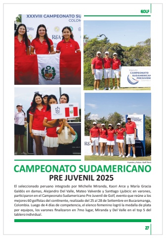 GOLF27Fuente y Fotos: Golf Per%u00faseleccionado peruano integrado por Michelle Miranda, Kaori Arce y Mar%u00eda Gracia Gald%u00f3s en damas, Alejandro Del Valle, Mateo Valverde y San ago Ljubicic en varones, par ciparon en el Campeonato Sudamericano Pre Juvenil de Golf, evento que re%u00fane a los mejores 60 golfistas del con nente, realizado del 25 al 28 de Se embre en Bucaramanga, Colombia. Luego de 4 d%u00edas de competencia, el elenco femenino logr%u00f3 la medalla de plata por equipos, los varones finalizaron en 7mo lugar, Miranda y Del Valle en el top 5 del ablero individual.CAMPEONATO SUDAMERICANO PRE JUVENIL 2025